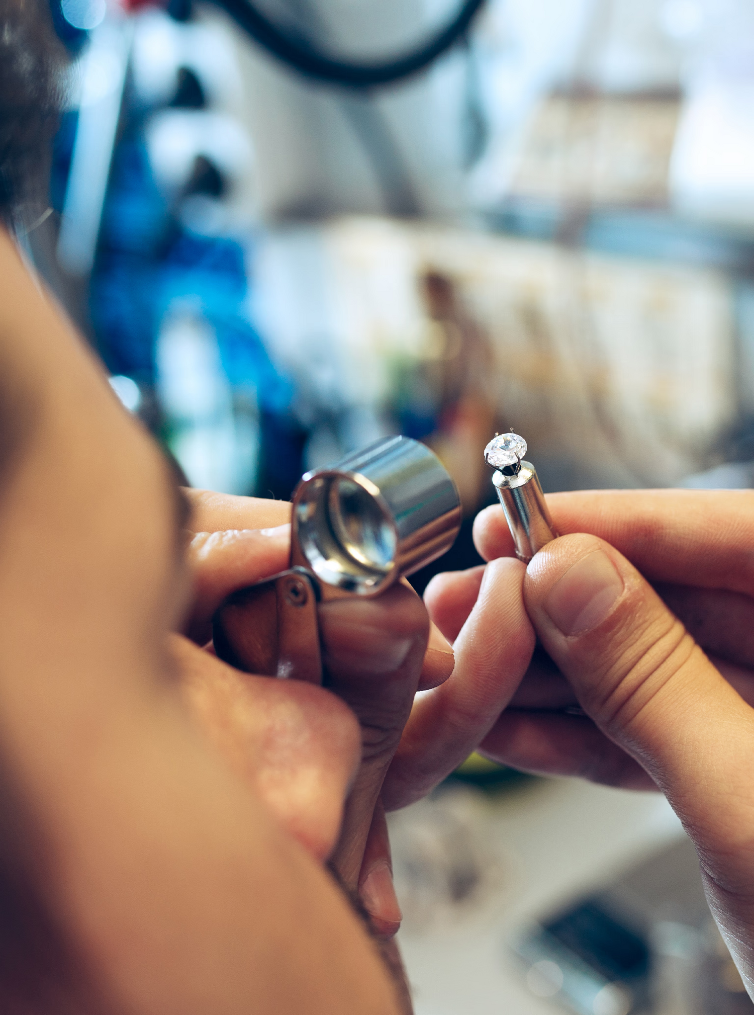 The diamond’s proportions and symmetry define the quality of the cut. A high-quality cut can only be created by a highly skilled craftsman. Diamonds are graded according to a scale from Ideal to Poor. Even the untrained eye will notice that diamonds with higher cut grades are more sparkly than those with lower cut grades.