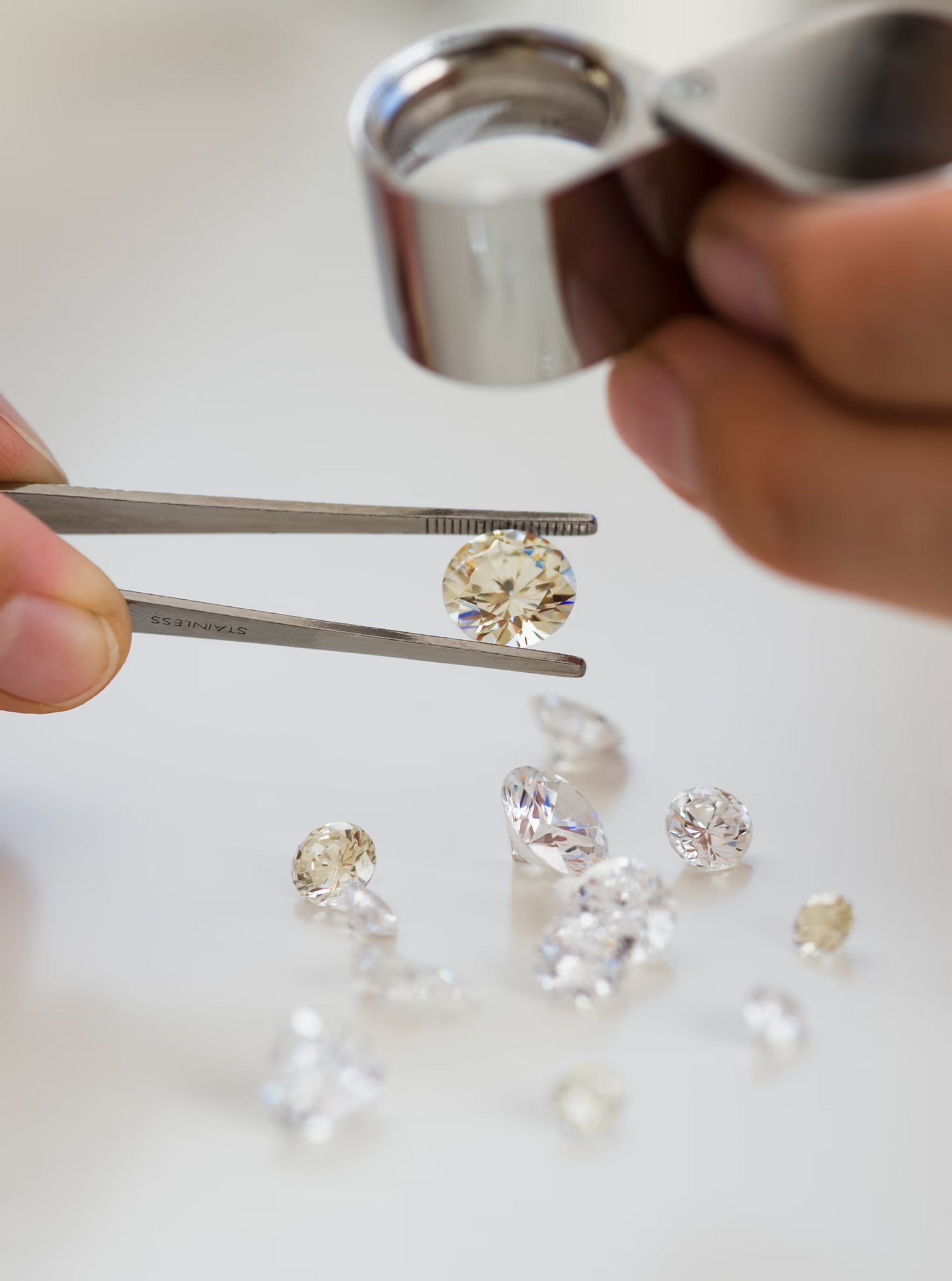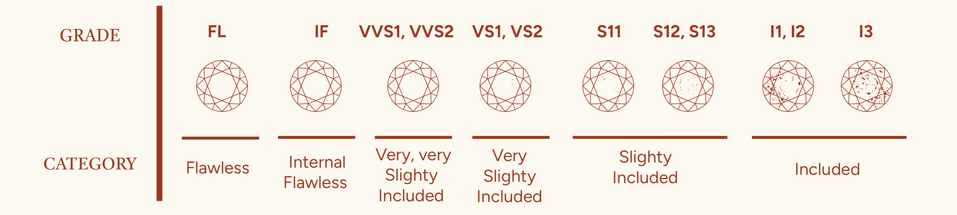 All diamonds are graded based on their clarity. Grading is determined by closely examining the diamond under 10X magnification. A gemologist will note the quantity, relief, and placement of inclusions to identify the clarity grade.