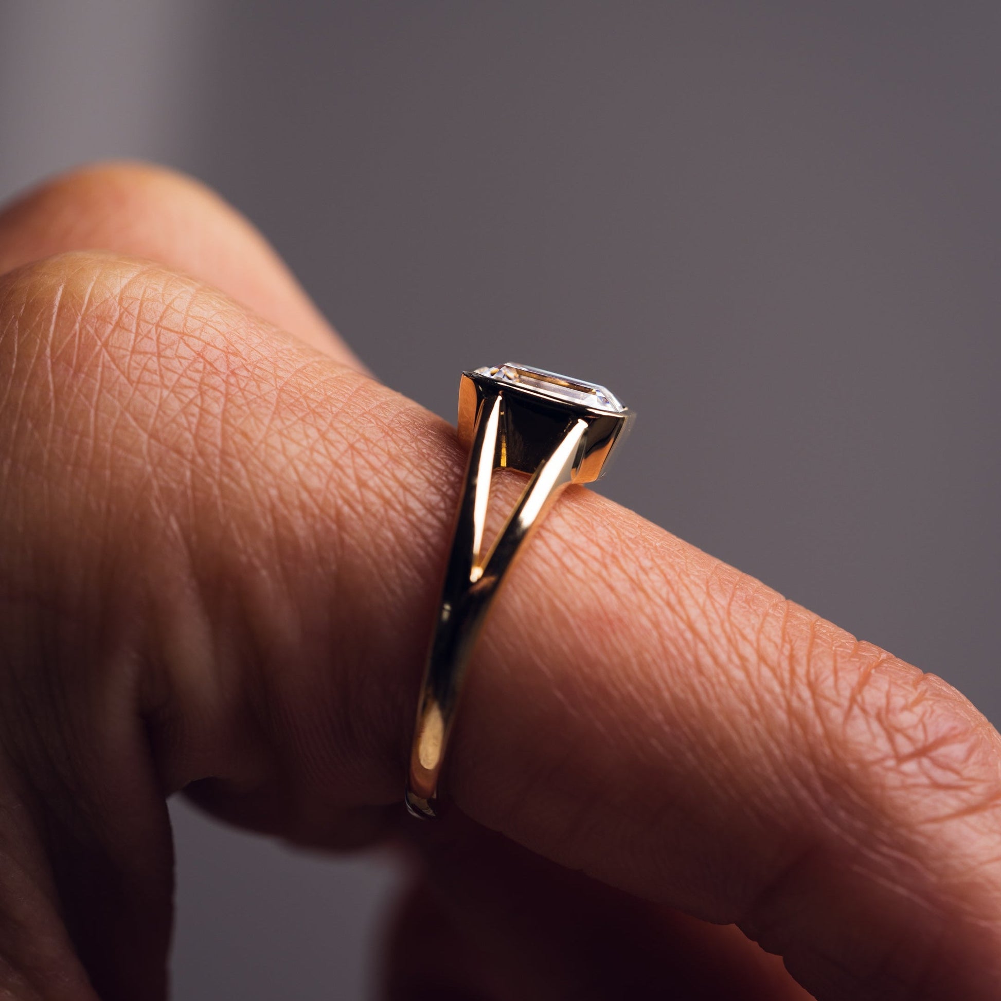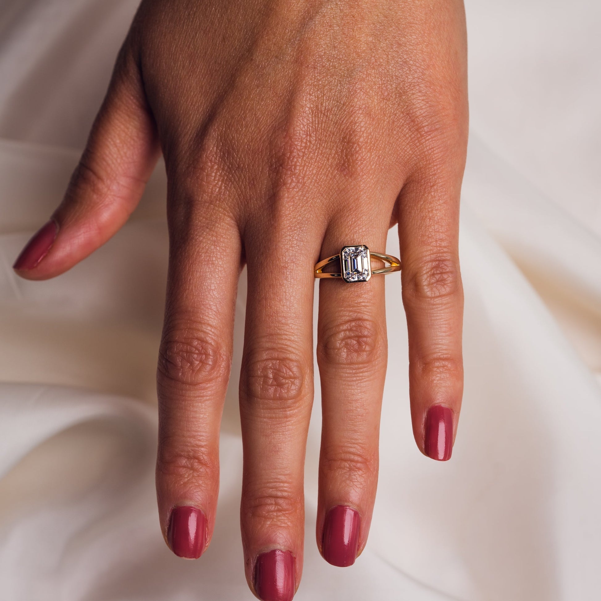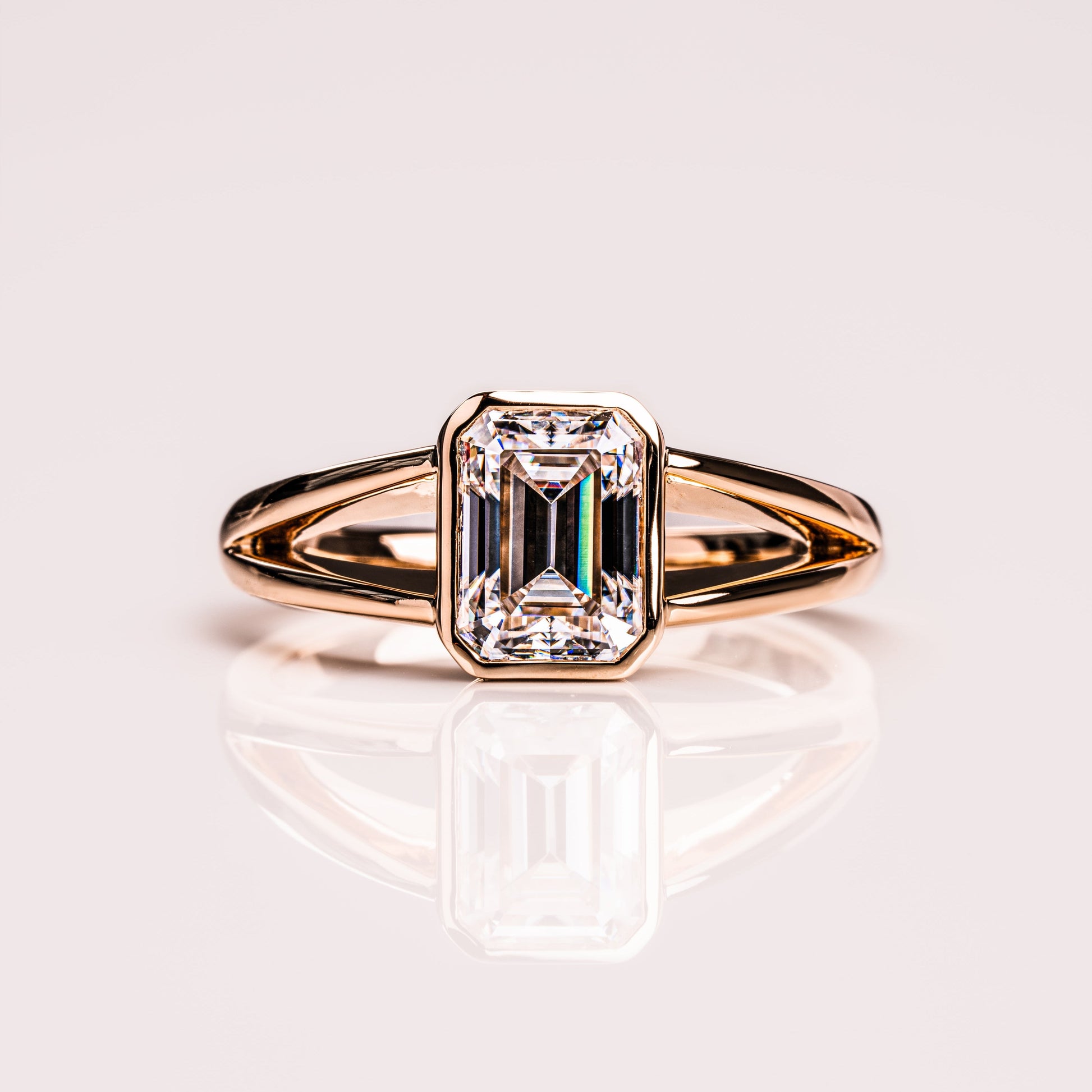 A 1.6 CT Emerald-cut Moissanite, defined by precise geometry and balanced proportions. Its clarity and structure create a composed, timeless presence.