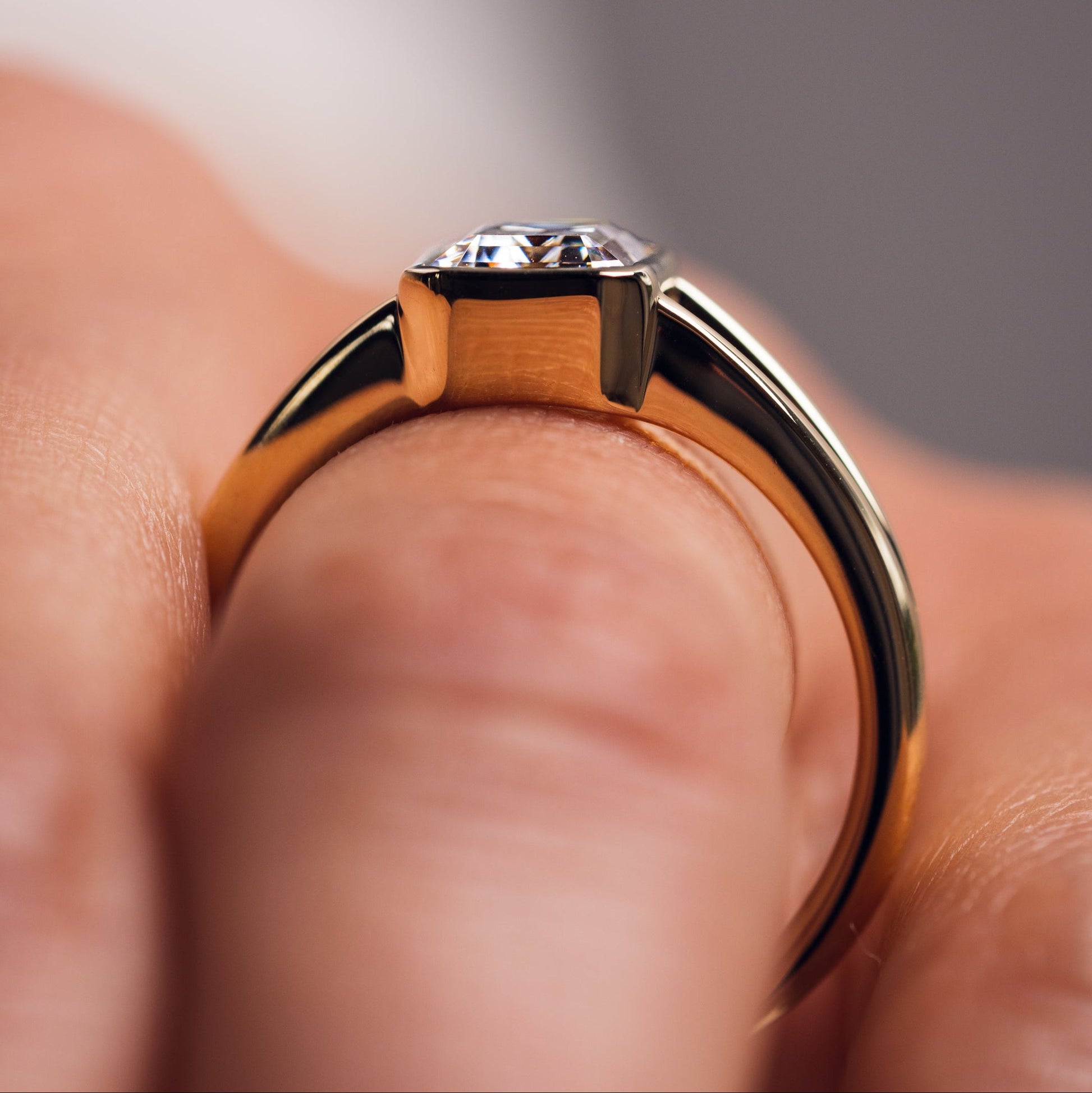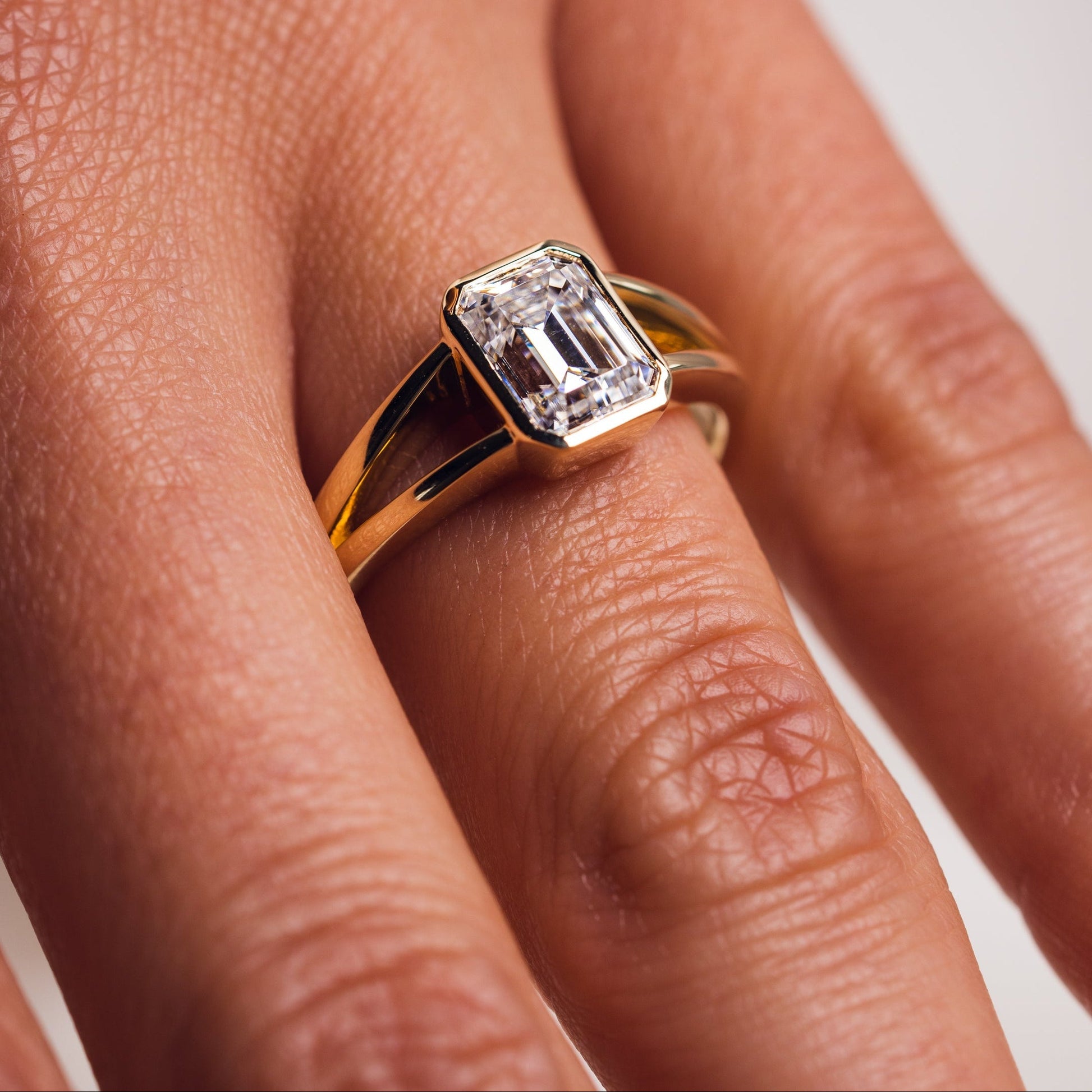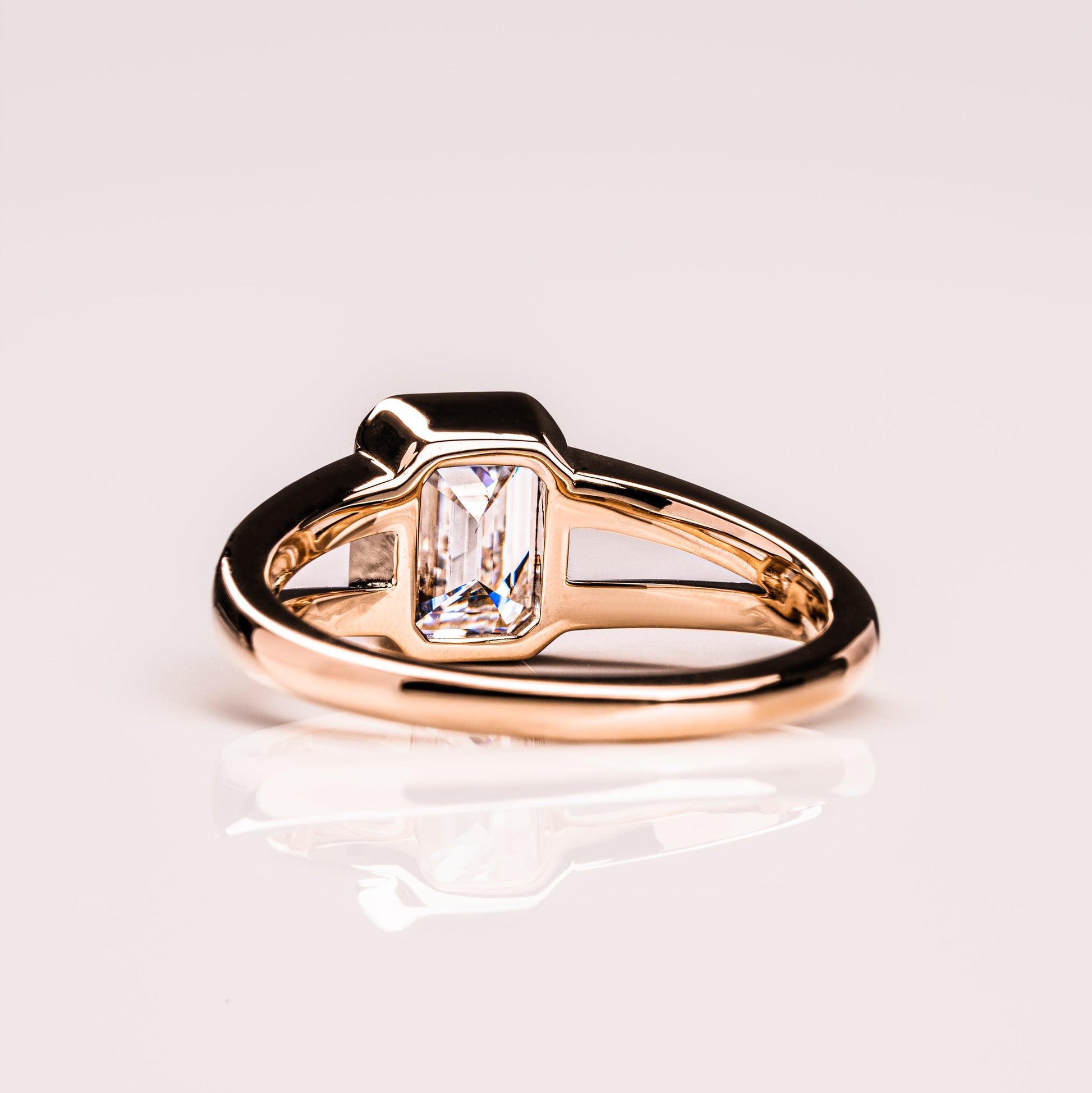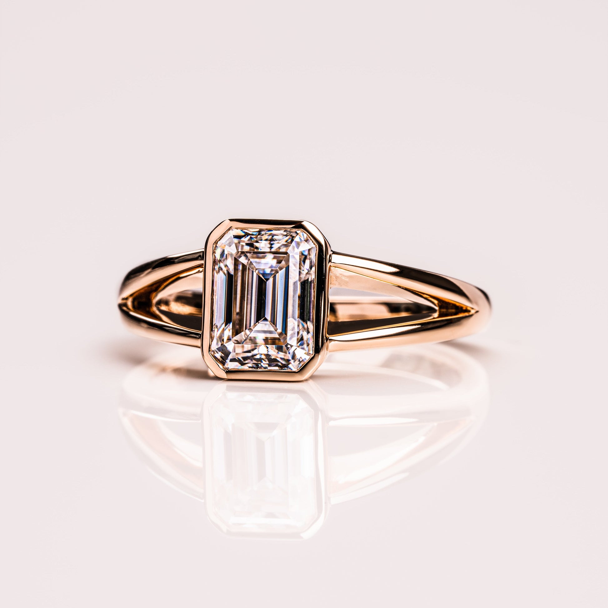 A 1.6 CT Emerald-cut Moissanite, defined by precise geometry and balanced proportions. Its clarity and structure create a composed, timeless presence.